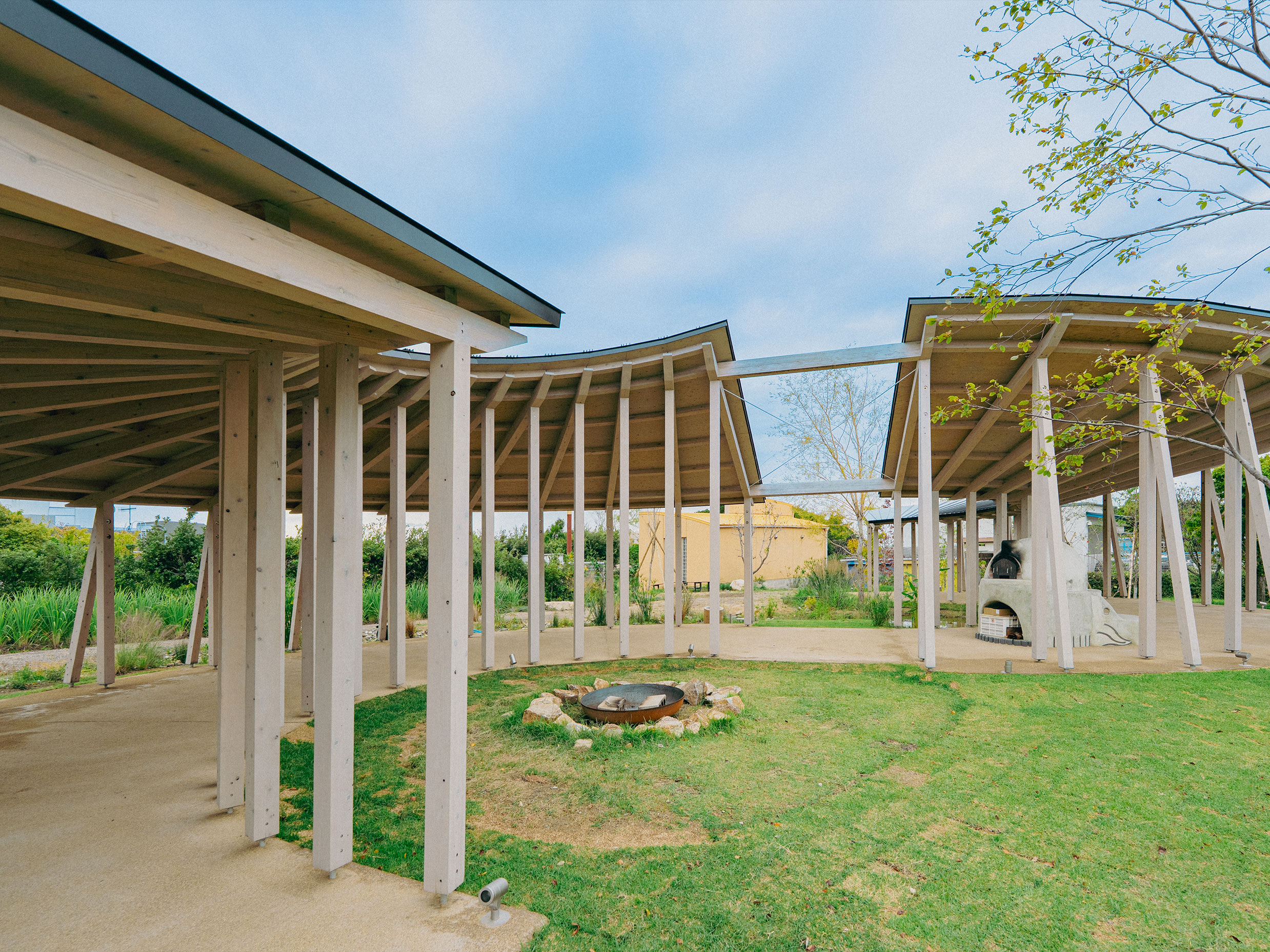 螺旋状のスパイラルガーデン、食べられる植物を収穫できるキッチンガーデンや果樹園、井戸水や雨水を活用したレインガーデンやビオトープ。大きなルーフの下で休んだり、自然体験プログラムを楽しんだり。