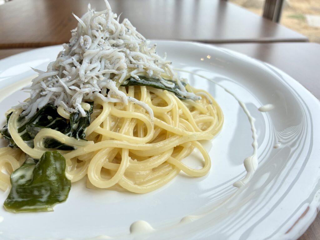 ボロネーゼは麺がタリアテッレ(淡路麺業さん)にアップデートされ、山盛りパルミジャーノチーズがかかった淡路牛100%の一皿。わさびクリームは淡路産特上わかめを使用し、淡路産しらすが山盛り乗った一皿です。ぜひご賞味ください。