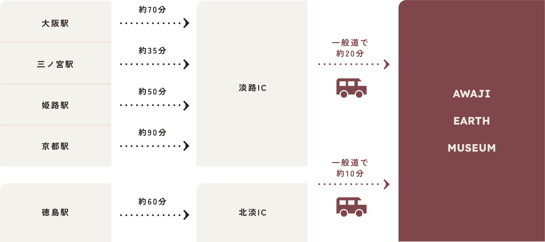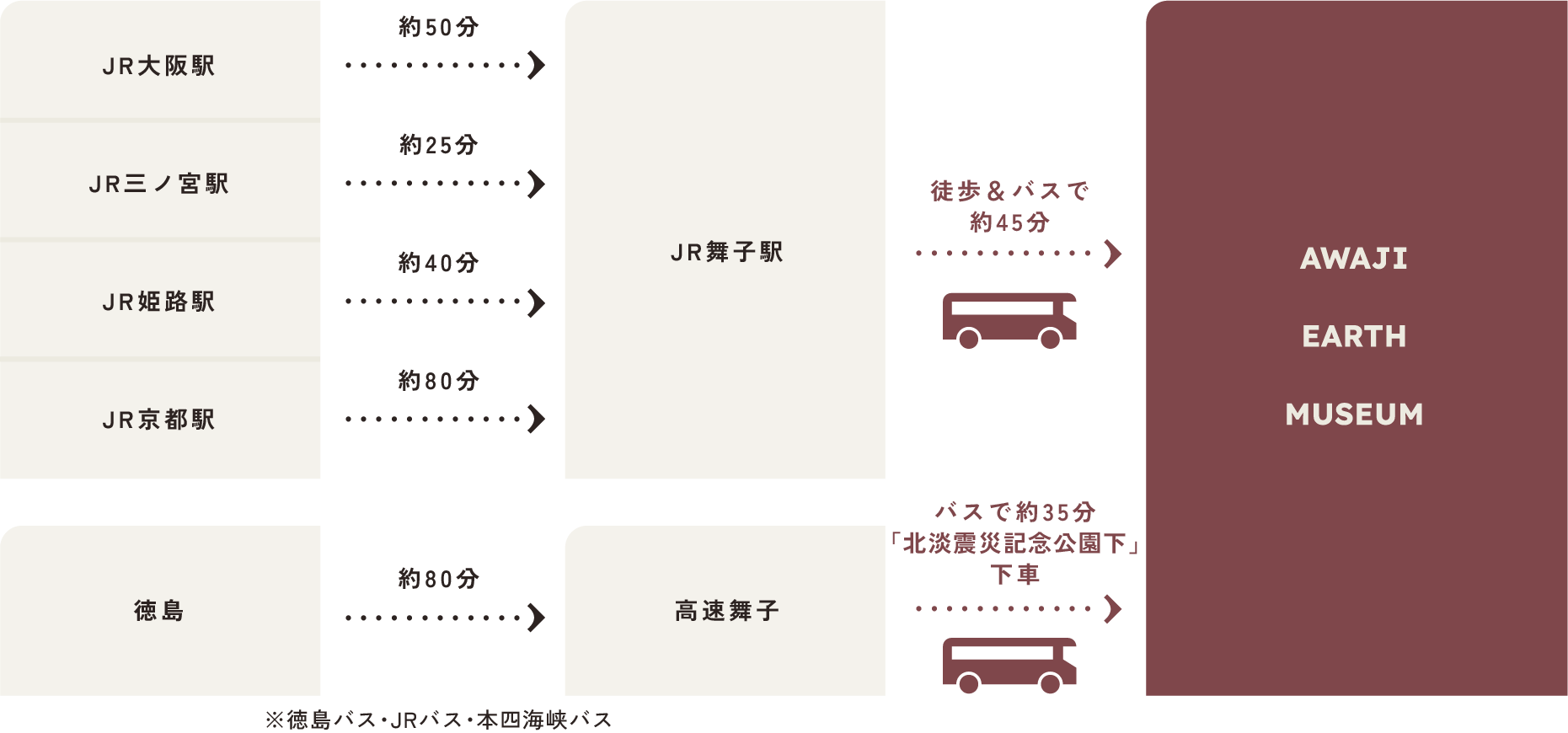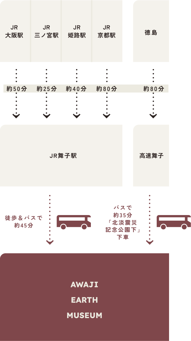 三宮、高速舞子から高速バスにて“北淡IC”で下車し、「あわ神あわ姫バス(淡路市生活観光バス)」に乗り換えて“北淡震災記念公園下”下車、徒歩約4分
