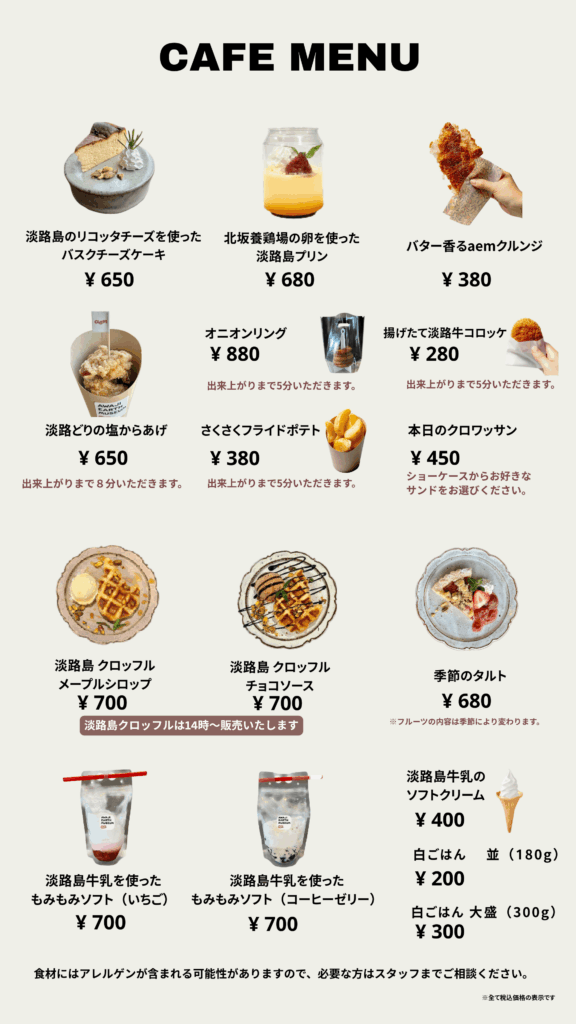 当店では、食品衛生法で表示が義務付けられている特定原材料8品目(卵、乳、小麦、そば、落花生、えび、かに、くるみ)を一部含んだ商品を提供しております。細心の注意を払って調理・管理を行っておりますが、同じ厨房内で特定原材料を使用しているため、調理過程においてアレルゲン物質が微量に混入する可能性がございます。