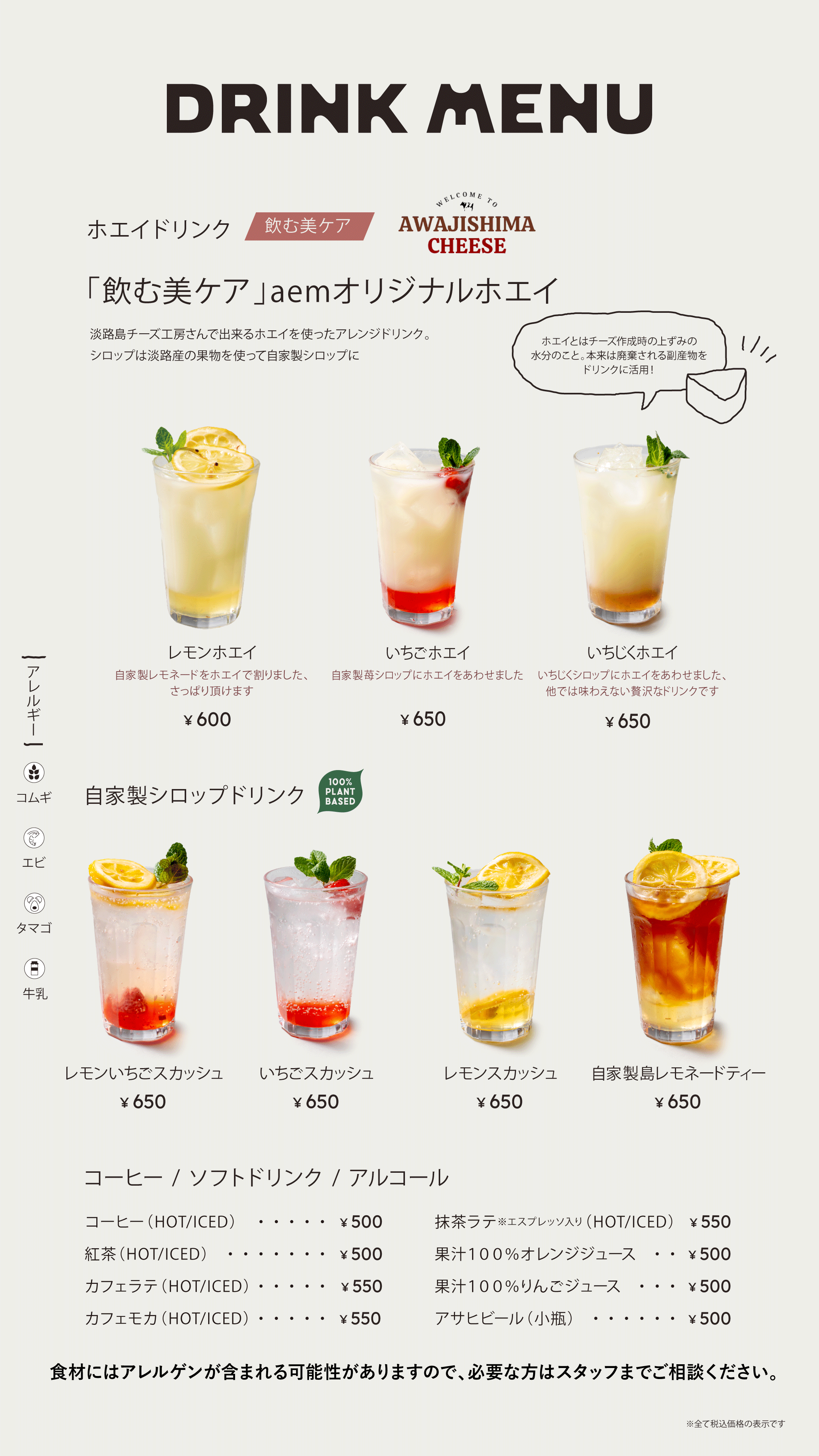 「飲む美活」aemホエイドリンクは淡路島チーズ工房ホエーと地元フルーツシロップを使ったあまくて冷たくてとっても美味しいドリンク♪