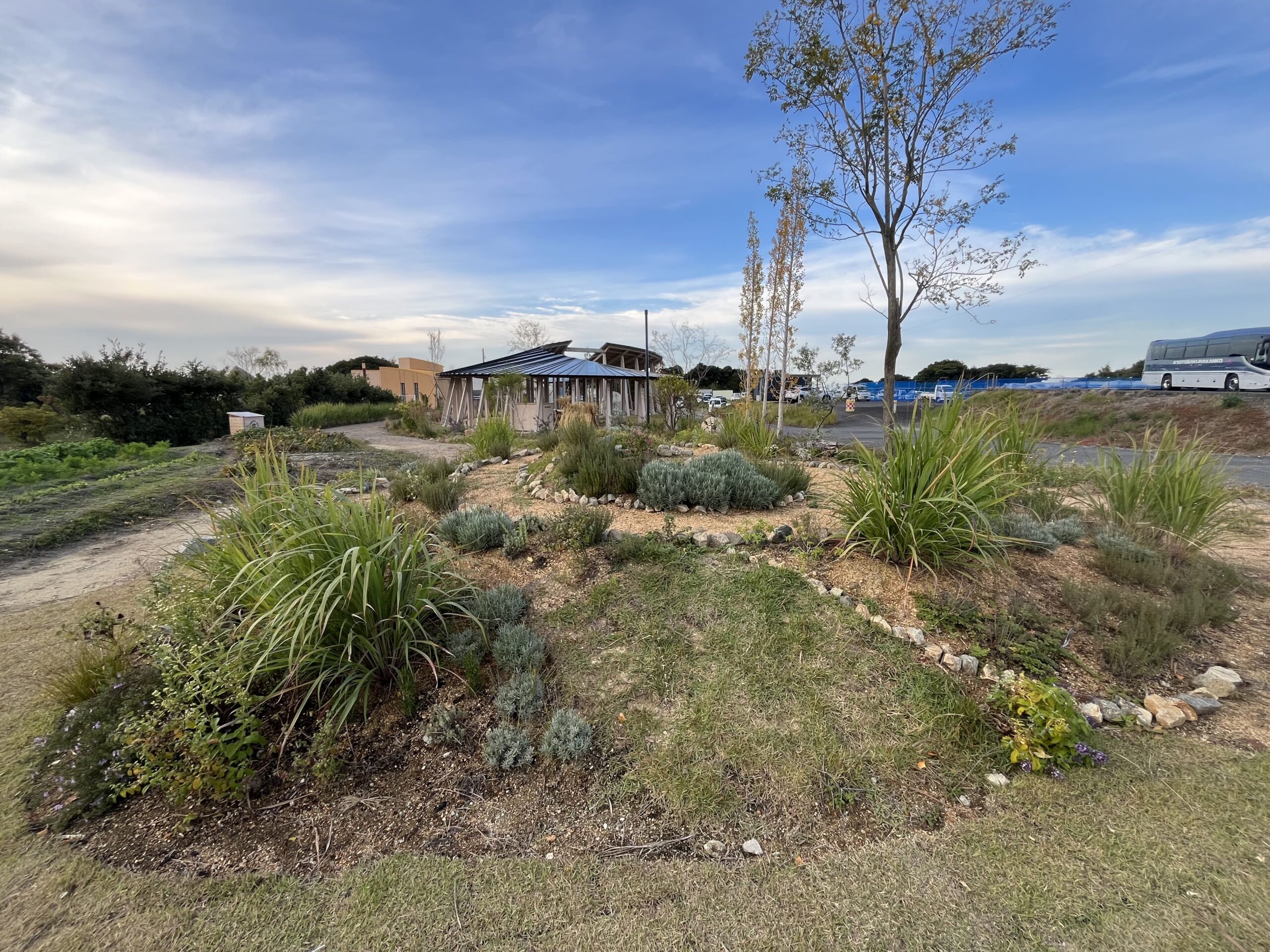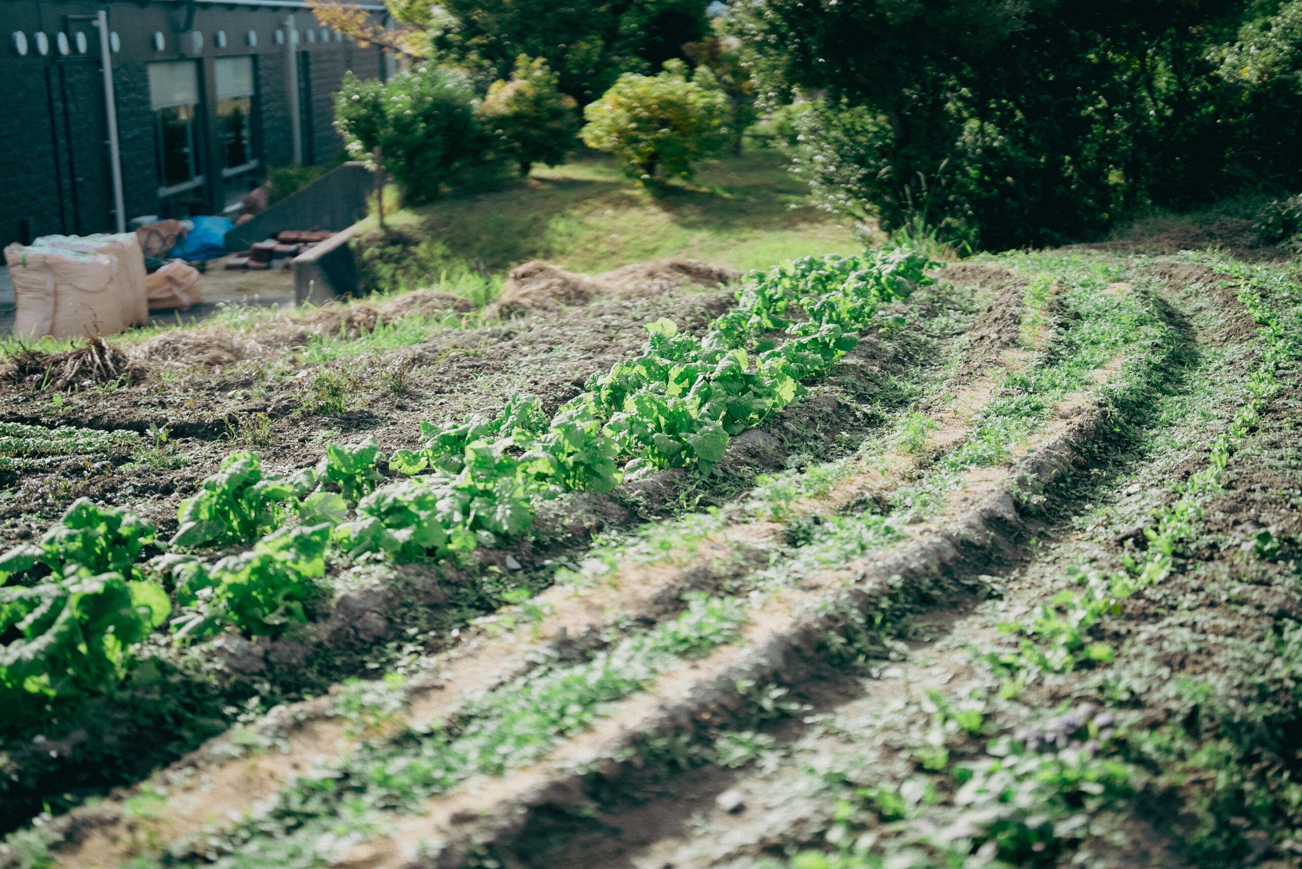畑や果樹、ハーブが育ち、東屋そばのビオトープには多彩な生きものたちも。