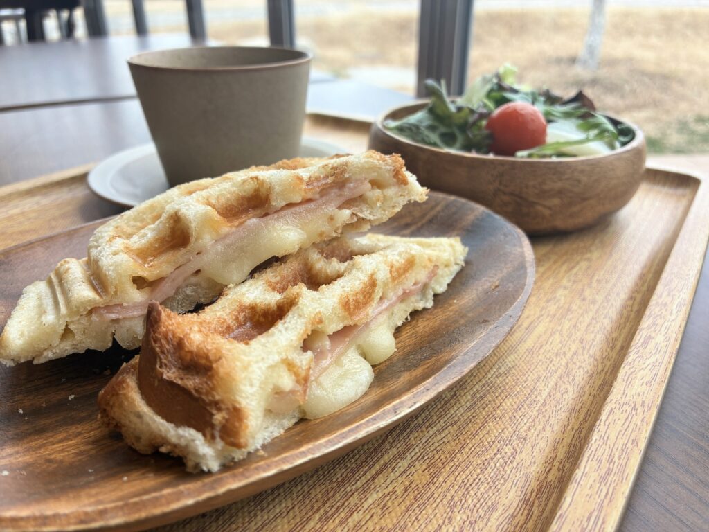 トロトロチーズが食欲をそそるハムチーズのホットサンドや、王道の焼きたてトースト、大きめクロワッサンなど。新鮮サラダや自家製ジャム、香り高いコーヒーと一緒にほっと一息。