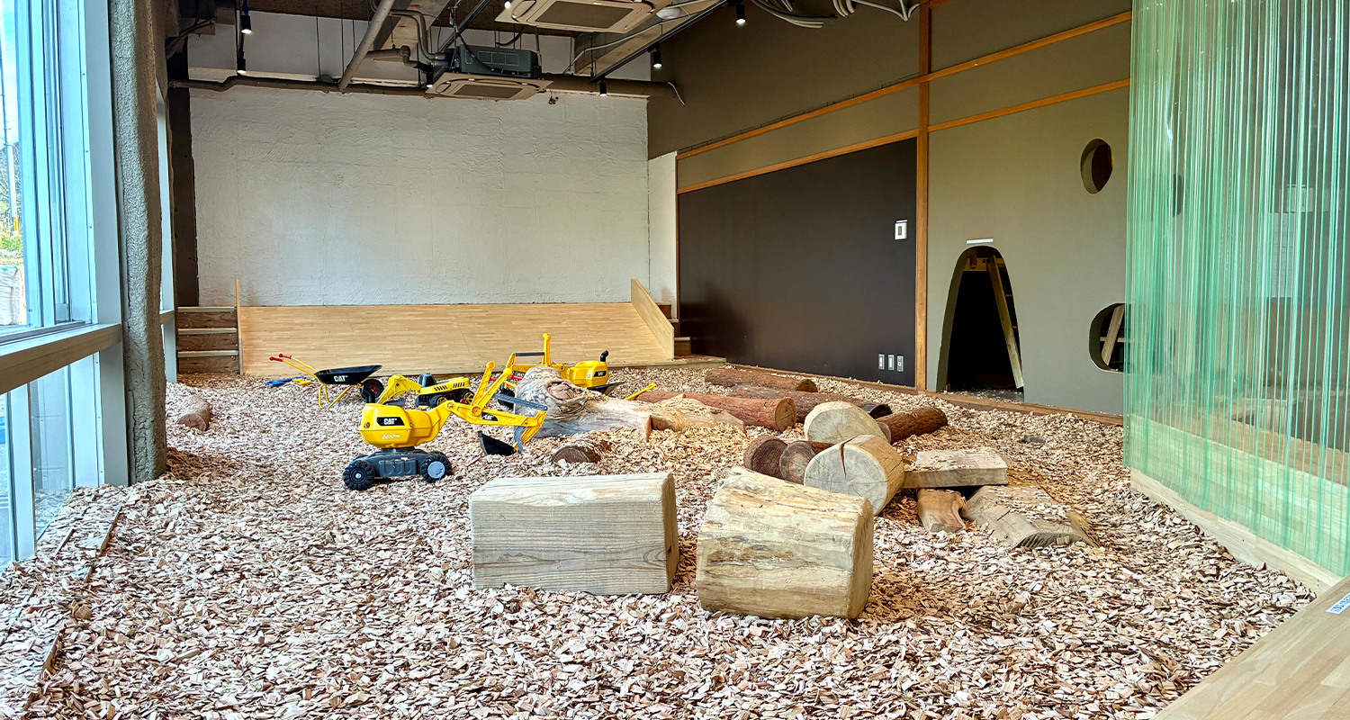 再生ウッドチップを贅沢に敷き詰めた、木の香りに包まれる空間。 自然のぬくもりに触れながら、お子様を安心して遊ばせられるリラックススペースです。