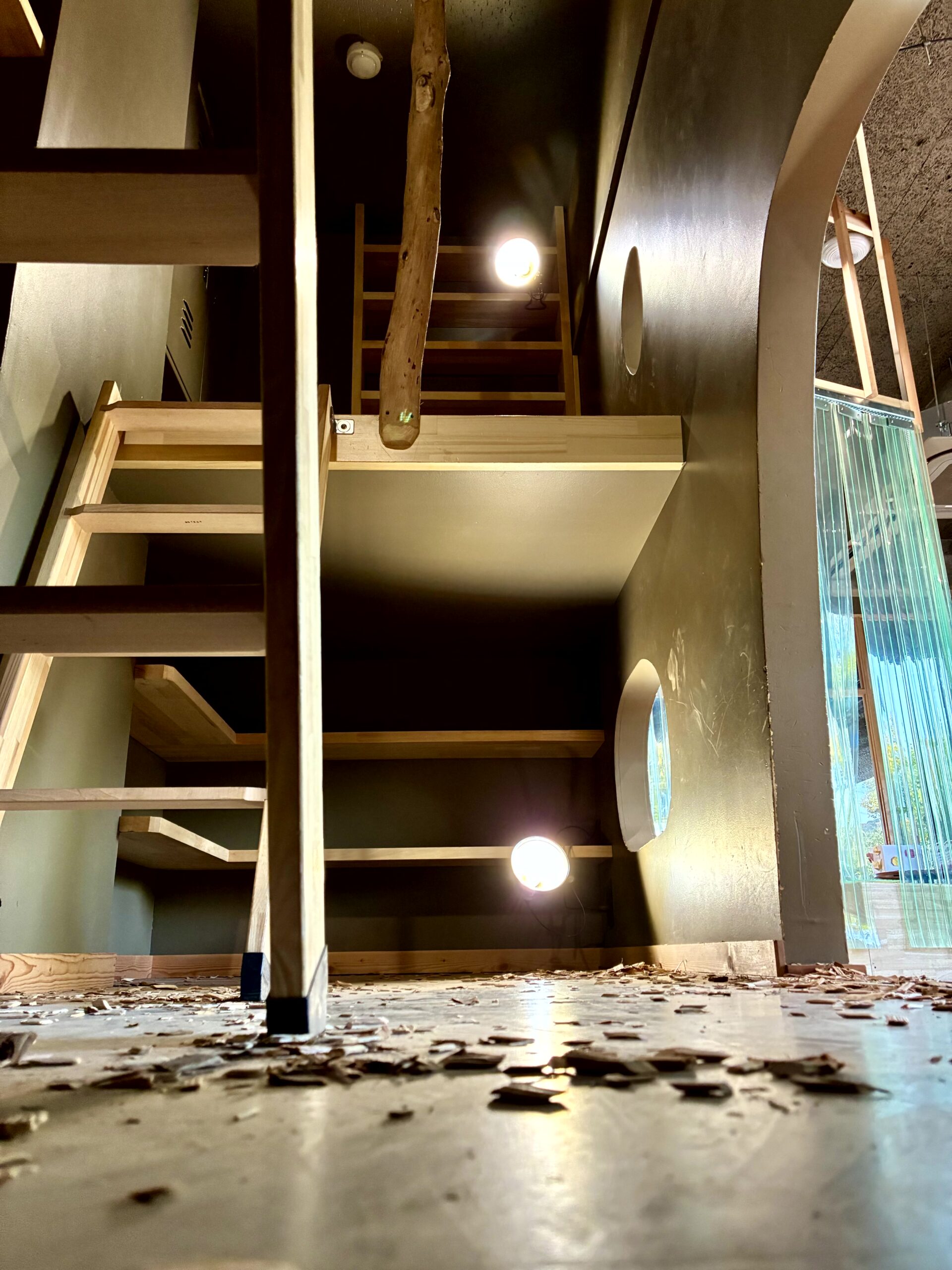 壁に穴があいた子どもたちのためのライブラリースペース。思わず覗き込みたくなるその中には、子どもが夢中になる絵本や物語がずらり。ハシゴを登って隠れたり遊び心あふれる、ワクワクの詰まった空間。