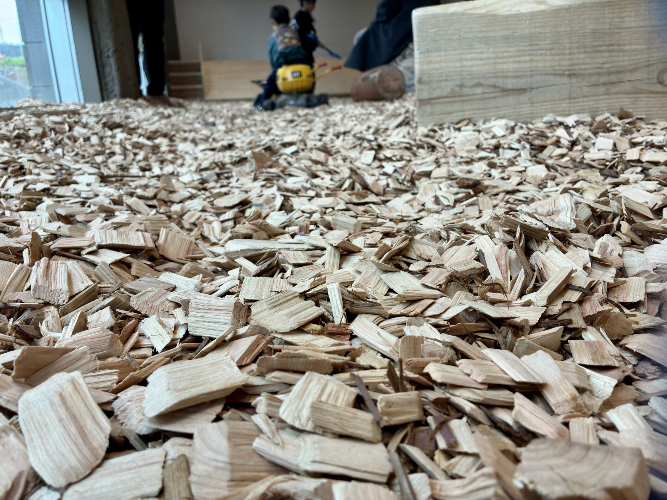 再利用可能な間伐材ウッドチップが一面に広がり、屋内でも“自然あそび”の体験を。